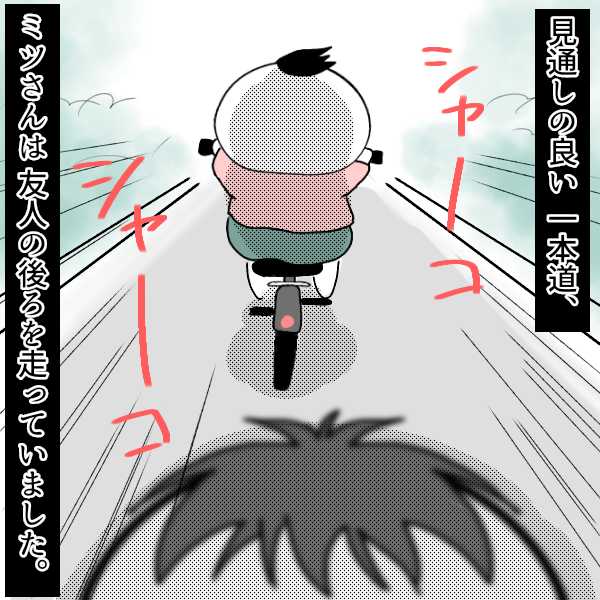 奇妙な話*自転車の怪① 2019/02/21 このお話は ミツさん(仮名・男性)の体験談です。実物の彼は長身イケメンですが、私の画力が続かないのと 怖さを半減させるため、デフォルメしたキャラで描いていきます🤣🤣笑 自転車の怪① デフォルメしすぎ😂😂 余談だけど 急に自転車が止まって 股を強打した経験ある人、結構いると思う・・・😂 ・・・・・・ そこには、 ガリガリに痩せた手 ミツさんの恐怖体験は続きます😱自転車と言えば 私の妹の体験談もいつか描きたいと思います。彼女は自転車で空を飛んだことがあります😂 笑笑 ②へ続きます 「怖い話」カテゴリの最新記事 タグ :#不思議#実話#怖かった話#恐怖体験談#漫画 < 前の記事次の記事 >