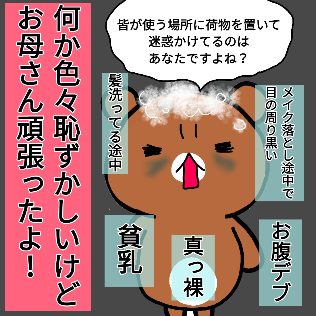 全裸で戦う母の愛 2020/01/01 私がブログを始める前の漫画です😂インスタを始めた2017年当時のものです。この頃は自画像(?)はスズメではなくクマでした😅いや、空いてない。全裸で物申すオバサン。その他の過去漫画↓ 「ほっこり話」カテゴリの最新記事 タグ :#エッセイ漫画#親の愛 < 前の記事次の記事 >